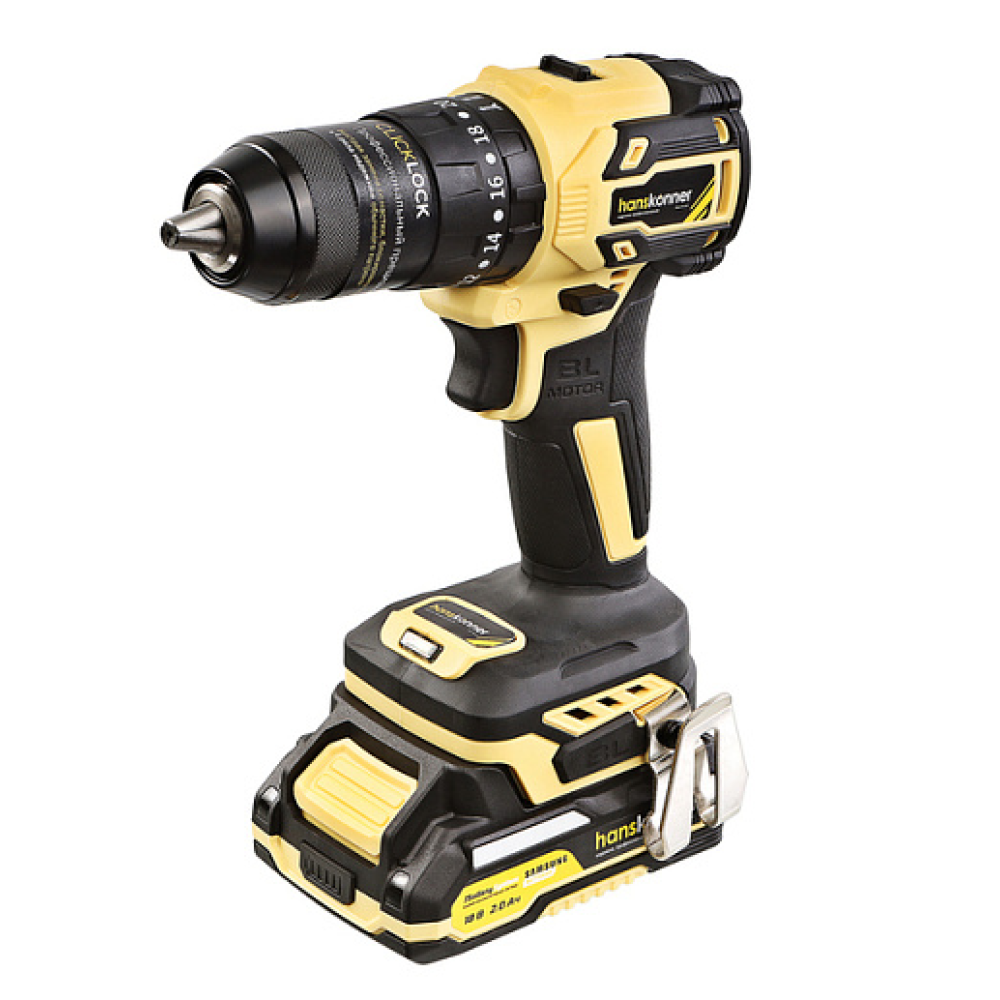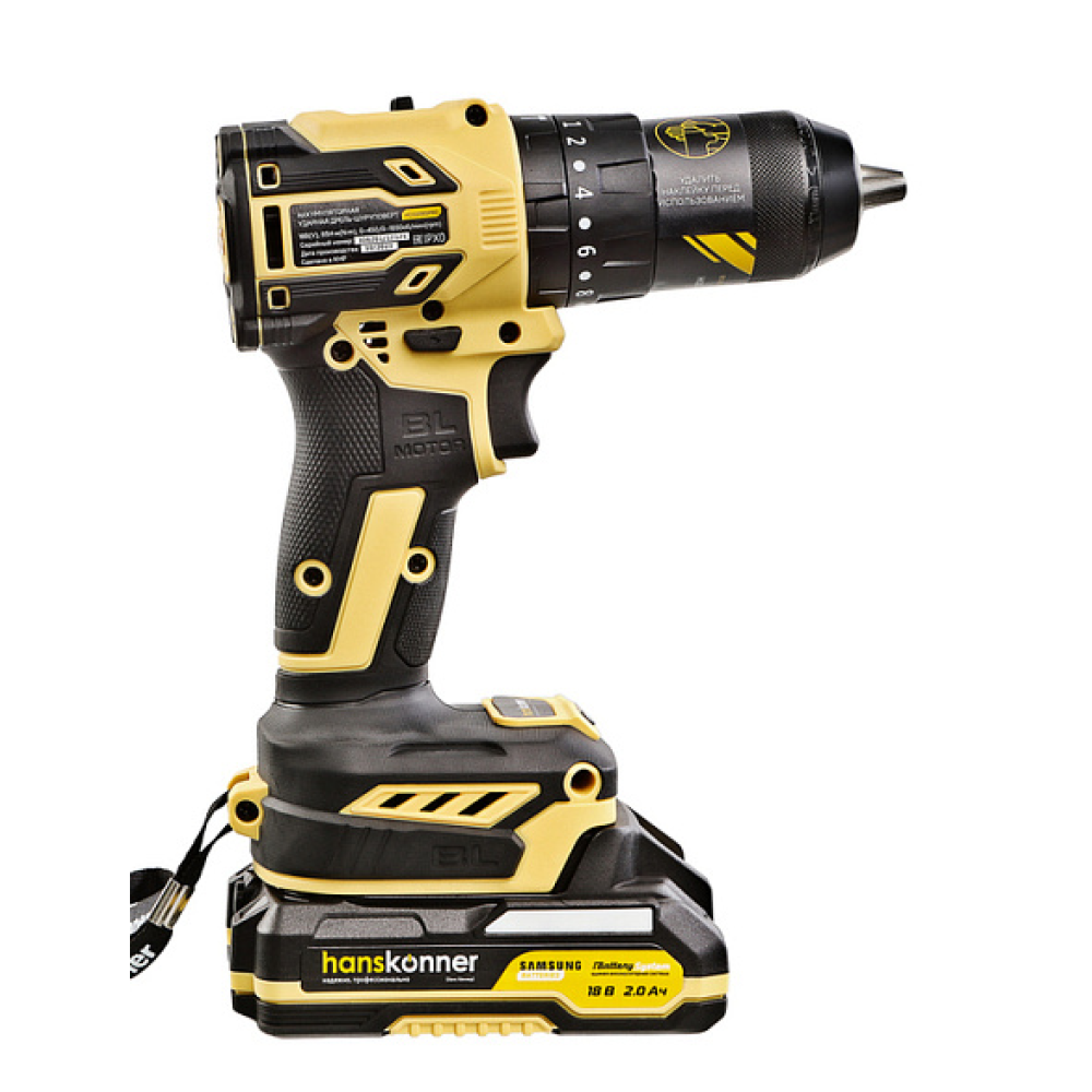 Hanskonner HCD2065PRO – аккумуляторный 18 В, ударный, двухскоростной шуруповерт – является частью системы 1BatterySystem, обеспечивающей совместимость одного и того же аккумулятора с целым рядом наименований инструмента. Модель обладает максимально сбалансированной компоновкой: небольшие размеры корпуса и рукояти позволяют эффективное использование инструмента в условиях с затрудненным доступом, а нейтральный центр тяжести, и обилие прорезиненных противоскользящих поверхностей способствуют надежному хвату, и лучшему контролю в процессе работы. Шуруповерт оснащен 18 В бесщеточным двигателем, характеризующимся на 30% лучшей производительностью в сравнении с коллекторными аналогами. Кроме того, бесщеточный двигатель отлично справляется с кратковременными перегрузками и не склонен к перегреву. Благодаря применению мощного планетарного механизма High Torque Technology, Hanskonner HCD2065PRO обладает высоким показателем максимального крутящего момента, достигающего 65 Н м. Имеет две скорости: режим пониженных оборотов (0 – 450 об/мин) предназначен для работ с крепежом, режим повышенных оборотов (0 – 1650 об/мин) – для сверления отверстий в различных материалах. Важная отличительная черта Hanskonner HCD2065PRO – наличие ударного механизма, что существенно повышает производительность работы при сверлении отверстий в кирпичной кладке, штукатурке, керамике, легком бетоне и неплотном камне. Усиленный цельнометаллический патрон c муфтой ClickLock и максимальным диаметром захвата 13 мм обеспечивает надежность фиксации, и расширяет набор применяемой оснастки для выполнения работ с повышенной нагрузкой. Предусмотрена функция блокировки вала, способствующая удобству смены оснастки одной рукой. К особенностям Hanskonner HCD2065PRO стоит отнести электронный тормоз выбега двигателя, гарантирующий мгновенную остановку патрона, эффективную LED-подсветку рабочей зоны WorkingLight с блоком коллиматорных линз, создающих направленный симметричный луч, а также индикатор остаточного заряда аккумулятора PowerCheck. Дополнительному комфорту использования способствуют специальная зацепная скоба крепления на пояс и страховочный ремешок на руку. Шуруповерт штатно комплектуется парой литий-ионных (Li-ion) аккумуляторов SAMSUNG емкостью 2.0 А ч и 4.0 А ч, с возможностью подзарядки от них через USB выход сторонних гаджетов, импульсным зарядным устройством с функцией быстрой зарядки (время зарядки АКБ 2.0 А ч– 50 мин, АКБ 4.0 А ч – 100 мин), USB LED-фонарем, запитываемым от АКБ, двухсторонней битой. Прочный кейс единой системы хранения инструмента HANSTORAGE гарантирует сохранность устройства и аксессуаров в процессе транспортировки.
