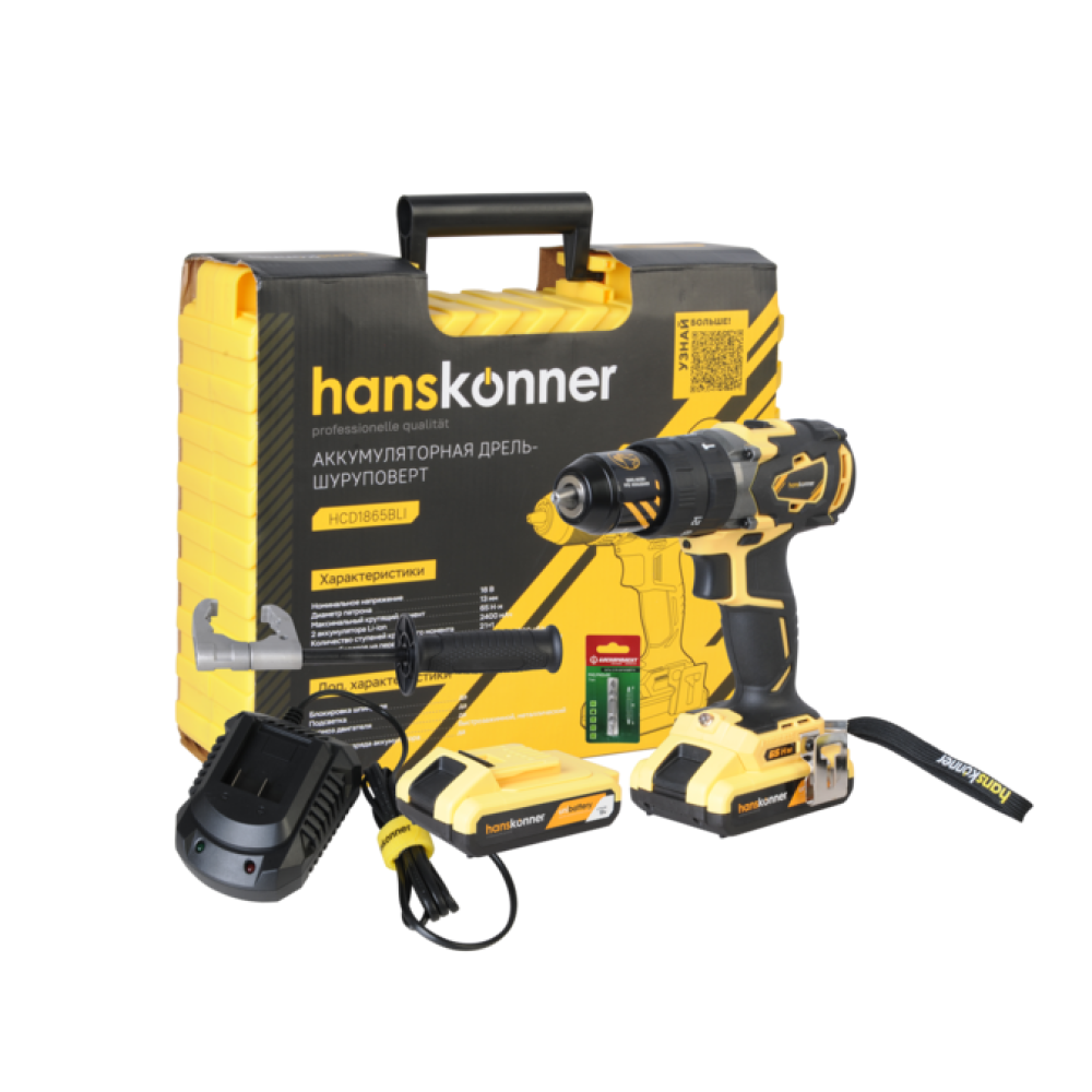 Установка на модели усиленного цельнометаллического патрона с максимальным диаметром захвата 13 мм позволила значительно расширить набор используемой оснастки. Инструмент обладает максимально сбалансированной компоновкой: небольшая толщина корпуса и рукояти позволяют его эффективное использование в условиях с трудным доступом, а нейтральный центр тяжести и обилие прорезиненных противоскользящих поверхностей способствуют надежному хвату и лучшему контролю в процессе работы. К особенностям Hanskonner HCD1865BLI Unibattery стоит отнести функцию блокировки вала шпинделя для удобной замена оснастки одной рукой, электронный тормоз выбега двигателя, гарантирующий мгновенную остановку патрона, а также LED-подсветку рабочей зоны с нижним размещением, что предполагает более эффективный охват рабочей зоны и исключение теней от патрона и оснастки. При необходимости, подсветка может включаться принудительно кратковременным нажатием на пусковую клавишу. Для удобства пользователя предусмотрена специальная зацепная скоба крепления на пояс, держатель для бит, а также страховочный ремешок на руку. Шуруповерт штатно комплектуется парой литий-ионных (Li-ion) аккумуляторов емкостью 2.4 Ач с индикацией остаточного заряда, импульсным зарядным устройством с функцией быстрой зарядки (0 – 100% – 60 мин, 0 – 80% – 35 мин), двухсторонней битой, а также пластиковым кейсом для удобства хранения и транспортировки.
