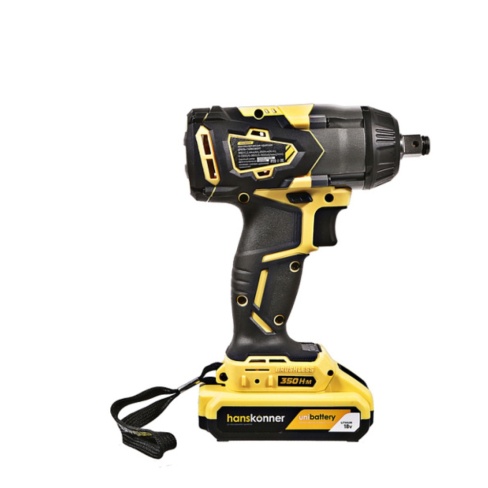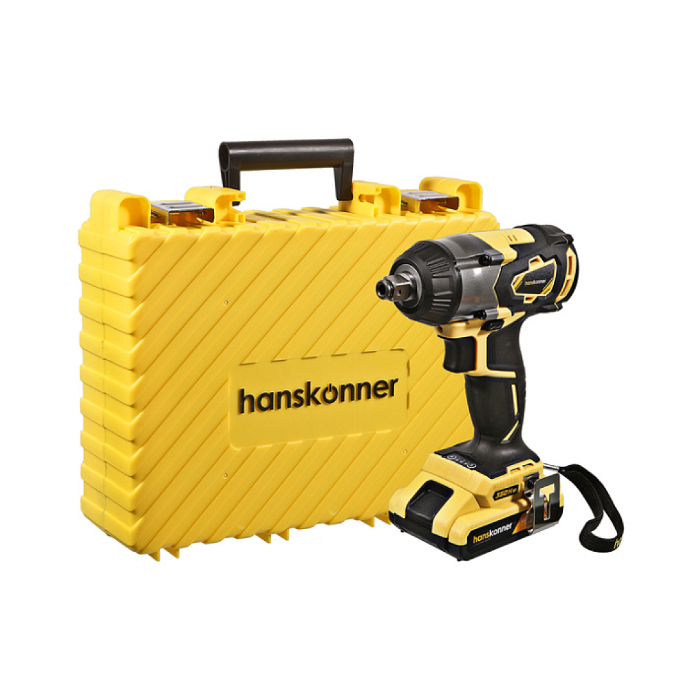 Hanskonner HCD18350S Unibattery – аккумуляторный 18 В ударный гайковерт с наружным квадратом 1/2″ и возможностью установки оснастки под шестигранник 1/4″ – относится к линейке Unibattery, обеспечивающей совместимость одного и того же аккумулятора с целым рядом наименований инструмента. Модель обладает максимально сбалансированной компоновкой: небольшие размеры корпуса и рукояти позволяют эффективное использование в условиях с затрудненным доступом, а нейтральный центр тяжести, и обилие прорезиненных противоскользящих поверхностей способствуют надежному хвату, и лучшему контролю. Гайковерт оснащен 18 В бесщеточным двигателем, характеризующимся на 30% лучшей производительностью в сравнении с коллекторными аналогами. Кроме того, бесщеточный двигатель отлично справляется с кратковременными перегрузками и не склонен к перегреву. Hanskonner HCD18350S имеет три режима настройки крутящего момента – пользователь выбирает нужный, исходя из поставленных задач. К особенностям модели стоит отнести электронный тормоз двигателя, а также индикатор остаточного заряда аккумулятора PowerCheck. Дополнительному комфорту использования способствует специальная зацепная скоба крепления на пояс и накидной ремешок на руку. Гайковерт штатно комплектуется парой литий-ионных (Li-ion) аккумуляторов емкостью 2.4 А ч, импульсным зарядным устройством. Прочный пластиковый кейс гарантирует сохранность устройства и аксессуаров в процессе транспортировки.