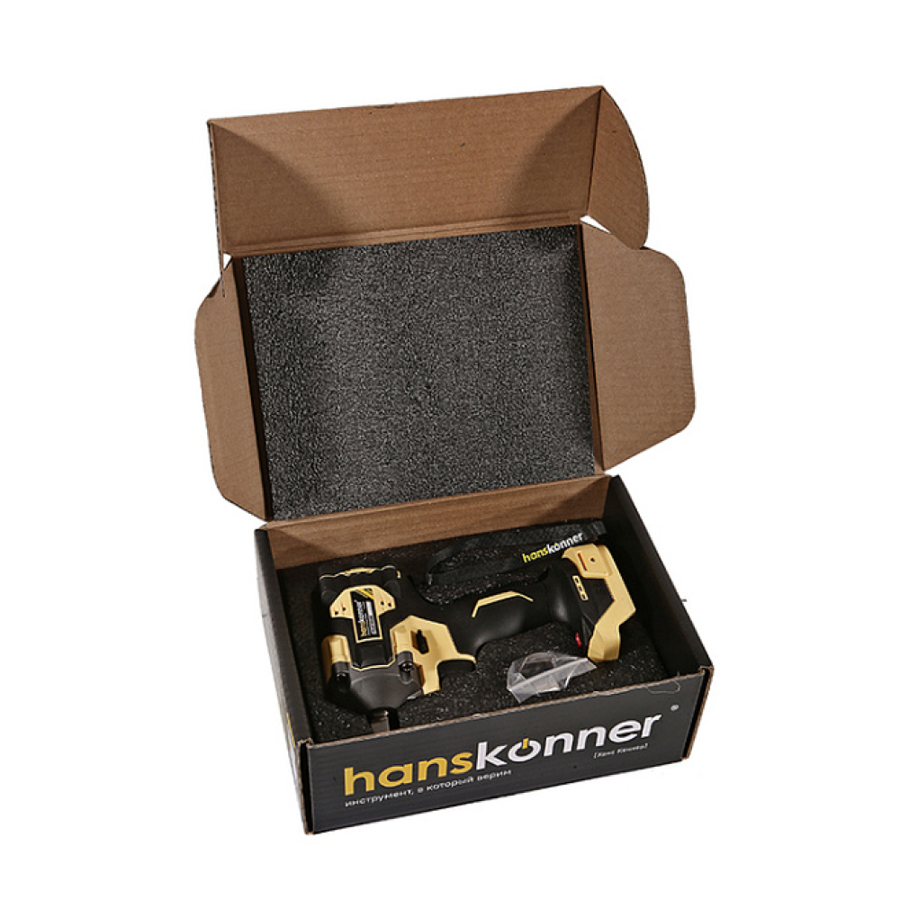 Hanskonner HCD20420BL – аккумуляторный 18 В, ударный гайковерт с наружным квадратом 1/2″ и возможностью установки оснастки под шестигранник 1/4″ – является частью системы 1BatterySystem, обеспечивающей совместимость одного и того же аккумулятора с целым рядом наименований инструмента. Модель обладает максимально сбалансированной компоновкой: небольшие размеры корпуса и рукояти позволяют эффективное использование в условиях с затрудненным доступом, а нейтральный центр тяжести, и обилие прорезиненных противоскользящих поверхностей способствуют надежному хвату, и лучшему контролю. Гайковерт оснащен 18 В бесщеточным двигателем, характеризующимся на 30% лучшей производительностью в сравнении с коллекторными аналогами. Кроме того, бесщеточный двигатель отлично справляется с кратковременными перегрузками и не склонен к перегреву. Модель Hanskonner HCD20420BL имеет два режима настройки крутящего момента: 280 Н м и 420 Н м – пользователь выбирает нужный, исходя из поставленных задач. Функция деликатного откручивания SoftMode обеспечивает максимально аккуратное откручивание прикипевшего крепежа, исключая его повреждение. К особенностям Hanskonner HCD20420BL стоит отнести электронный тормоз двигателя, эффективную LED-подсветку рабочей зоны WorkingLight с блоком коллиматорных линз, создающих направленный симметричный луч.