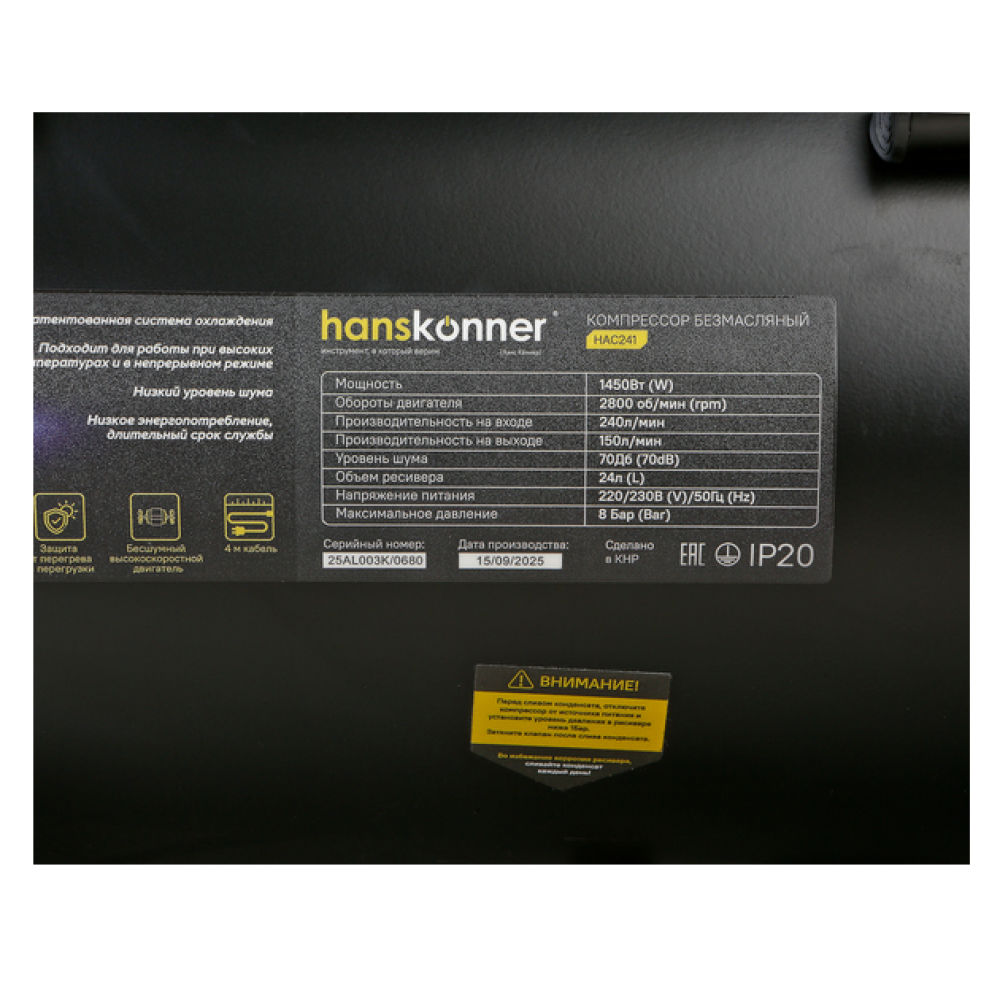 | Объем ресивера24 л | Типбезмаслянный | ПроизводительHanskonner |