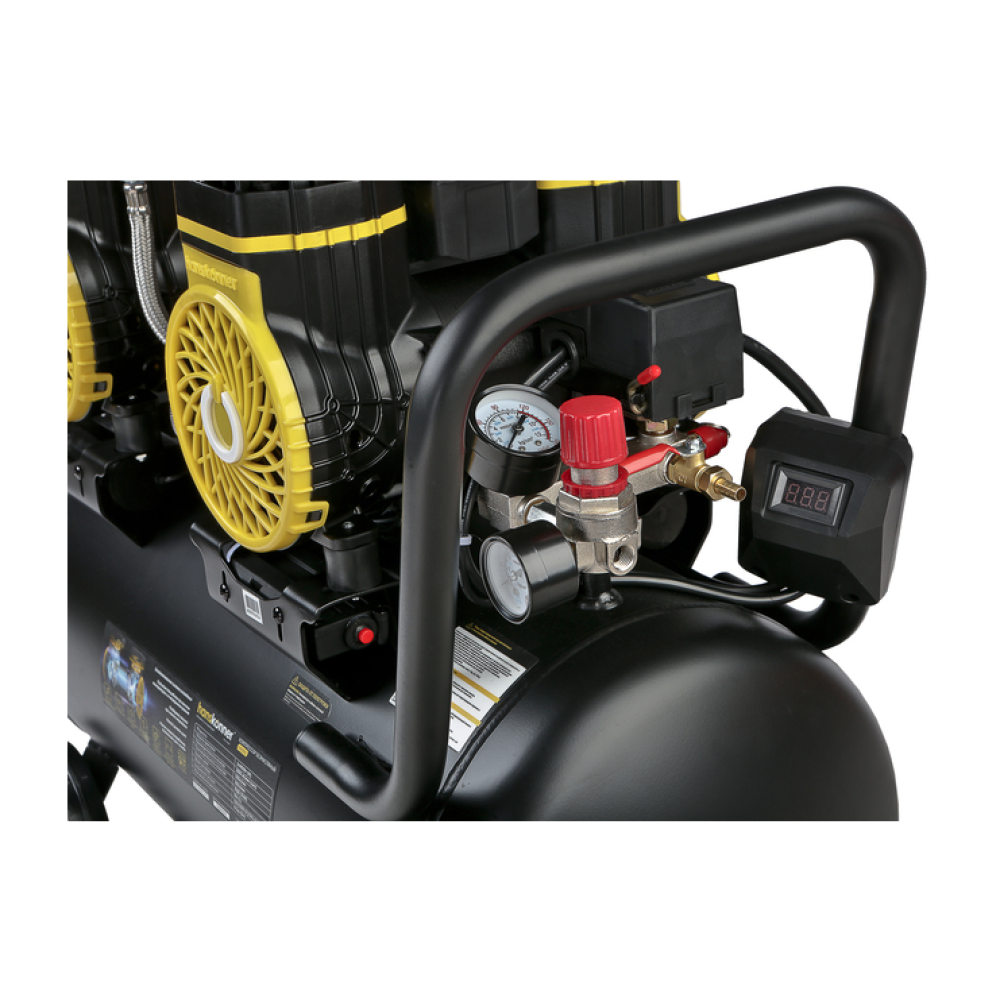 Современный 4-х цилиндровый двигатель c повышенным числом оборотов, скорость в два раза выше стандарта для безмасляных компрессоров. Легко запускается в минусовую температуру благодаря отсутствию в конструкции загустевающего на холоде масла. * Три двигателя на установке позволяют поднимать давление в баке 100л с 0 до 8 Бар за 2 минуты * Последовательное включение двигателей с помощью электронного блока управления обеспечивает низкий пусковой ток. Возможность включения от 1 до 3 двигателей в зависимости от потребности потребителя позволяет экономить электроэнергию. * SilentDesign – низкий уровень шума. Уровень шумового давления компрессора сравним с громкостью обычного человеческого разговора, что делает его идеальным для работы в помещениях. * Два быстросъемных EURO коннектора для легкого и быстрого подключения шлангов с пневмоинструментом. Возможность одновременной работы двух потребителей сжатого воздуха.
