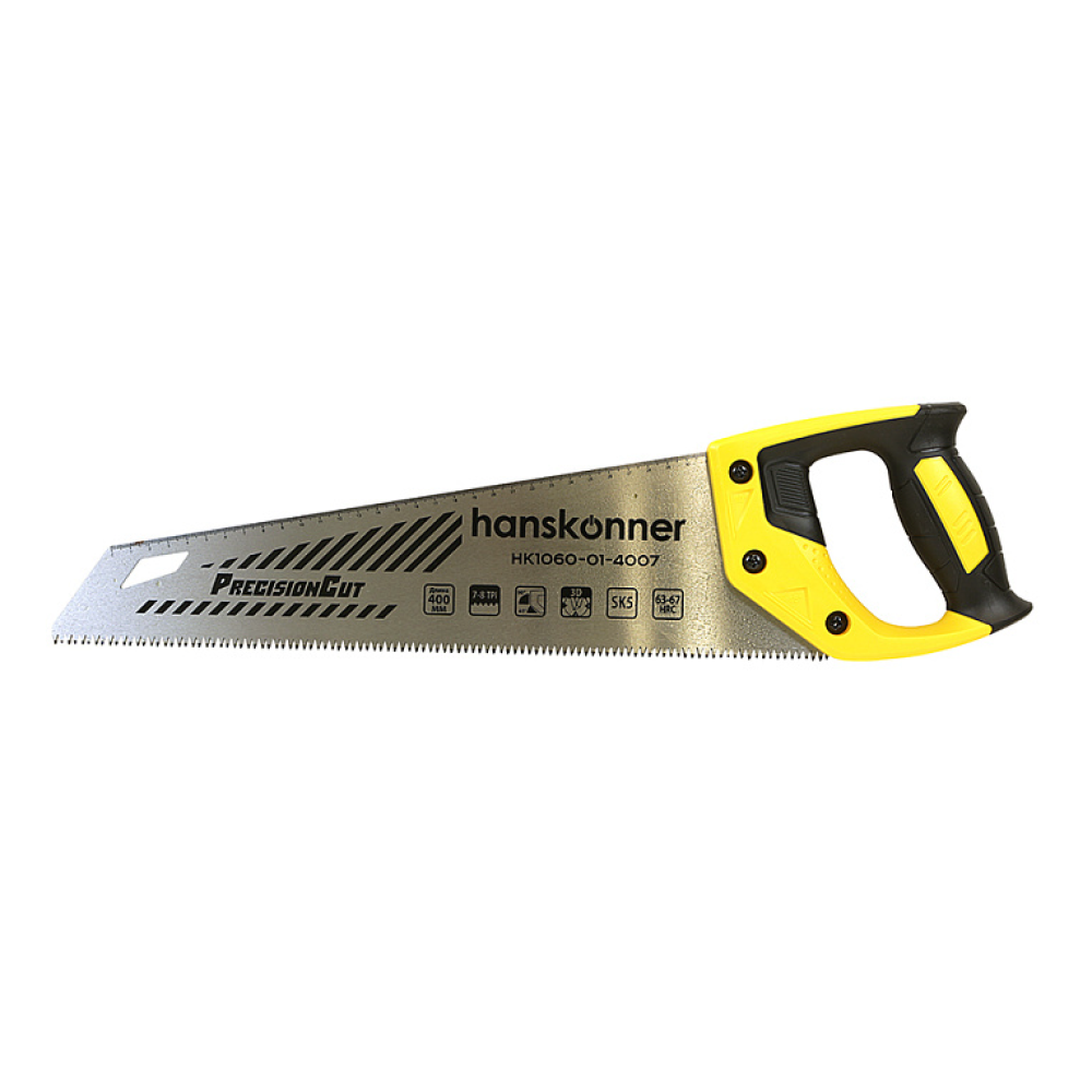 Ножовка по дереву Hanskonner HK1060-01-4007. Сталь SK5 держит заточку до 3-х раз дольше обычной, а так же поозволяет добиться на 15% большей закалки зубьев (63-67HRC) без потери прочности.