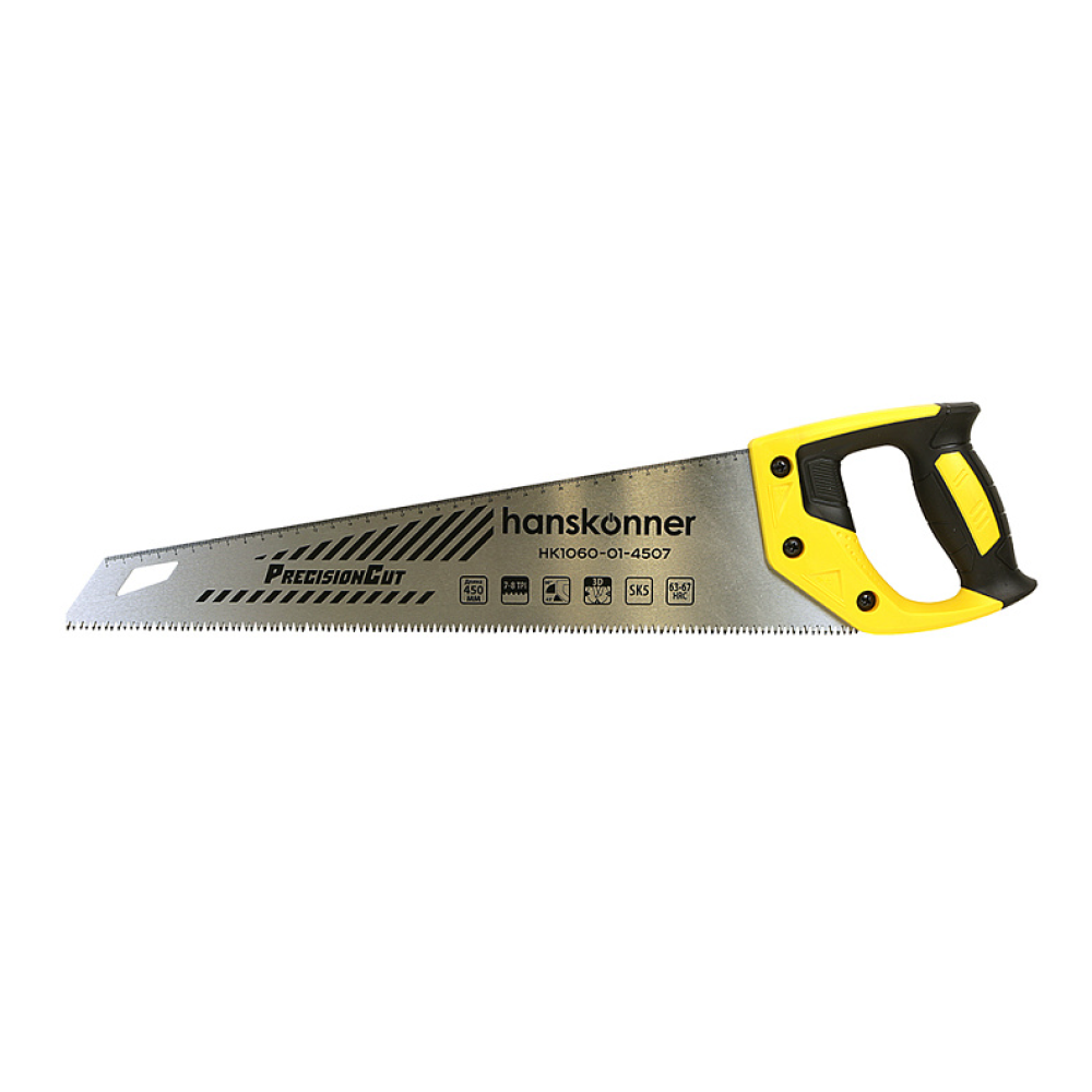 Ножовка по дереву Hanskonner HK1060-01-4507. Сталь SK5 держит заточку до 3-х раз дольше обычной, а так же поозволяет добиться на 15% большей закалки зубьев (63-67HRC) без потери прочности.