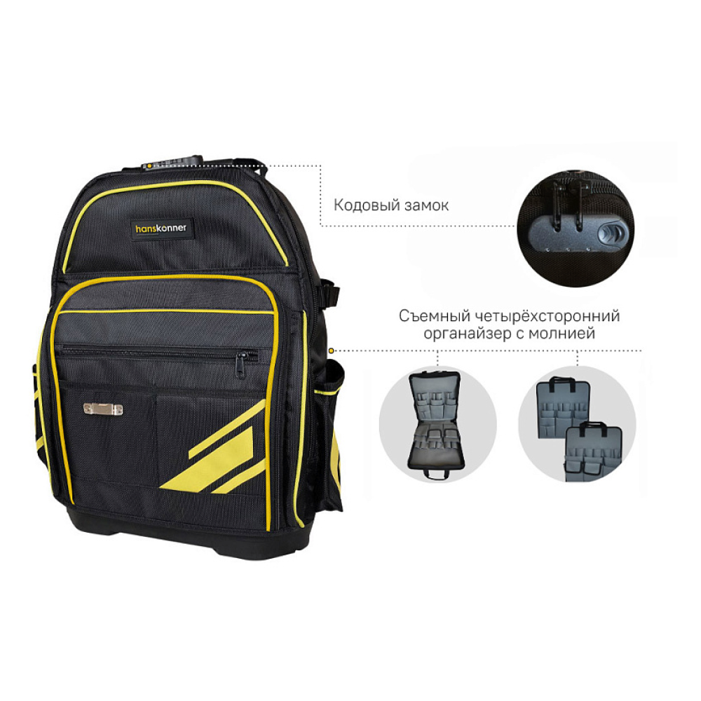 Дополнительные вставки в стенки и дно рюкзака позволяют ему лучше держать эргономичную форму при переноске инструментов.