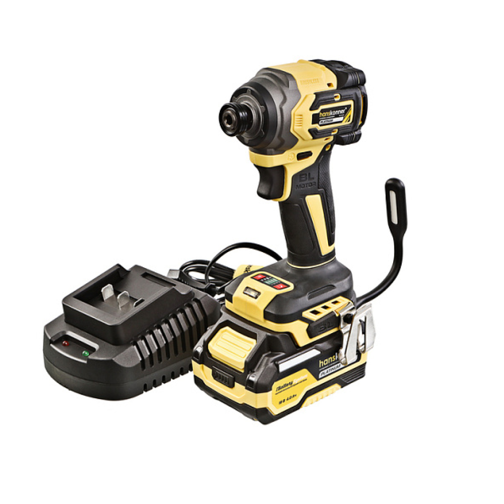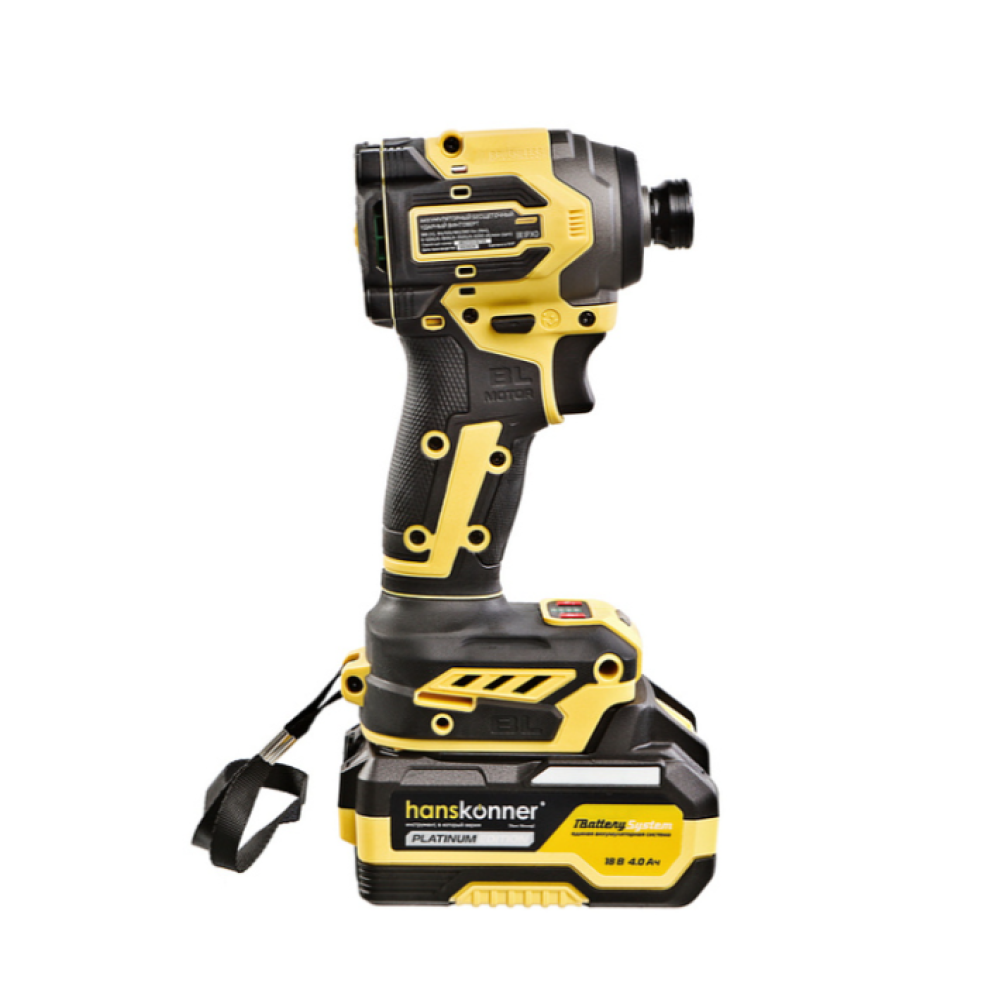 Hanskonner HCD20280BLС – аккумуляторный 18 В, ударный винтоверт с типом гнезда под шестигранник 1/4 ″ – является частью системы 1BatterySystem, обеспечивающей совместимость одного и того же аккумулятора с целым рядом наименований инструмента. Модель обладает максимально сбалансированной компоновкой: небольшие размеры корпуса и рукояти позволяют эффективное использование в условиях с затрудненным доступом, а нейтральный центр тяжести, и обилие прорезиненных противоскользящих поверхностей способствуют надежному хвату, и лучшему контролю. Винтоверт оснащен 18 В бесщеточным двигателем, характеризующимся на 30% лучшей производительностью в сравнении с коллекторными аналогами. Кроме того, бесщеточный двигатель отлично справляется с кратковременными перегрузками и не склонен к перегреву. Благодаря применению мощного планетарного механизма, Hanskonner HCD20280BLС уверенно демонстрирует высокие показатели крутящего момента (до 280 Н м), что позволяет работать с крепежом большой длины и диаметра. Винтоверт имеет четыре режима настройки момента затяжки: 60 Н м, 120 Н м, 180 Н м, 280 Н м – пользователь выбирает нужный, исходя из конкретного материала и крепежа. Модель оснащена функцией AutoStop, плавно останавливающей вал шпинделя сразу после откручивания крепежа. К особенностям Hanskonner HCD20280BLC стоит отнести эффективную LED-подсветку рабочей зоны WorkingLight с блоком коллиматорных линз, создающих направленный симметричный луч, а также индикатор остаточного заряда аккумулятора PowerCheck. Дополнительному комфорту использования способствуют специальная зацепная скоба крепления на пояс и страховочный ремешок на руку. Винтоверт штатно комплектуется литий-ионным (Li-ion) аккумулятором емкостью 4.0 А ч с возможностью подзарядки от него через USB выход сторонних гаджетов, импульсным зарядным устройством, USB LED-фонарем, запитываемым от АКБ. Прочный кейс единой системы хранения инструмента HANSTORAGE гарантирует сохранность устройства и аксессуаров в процессе транспортировки.