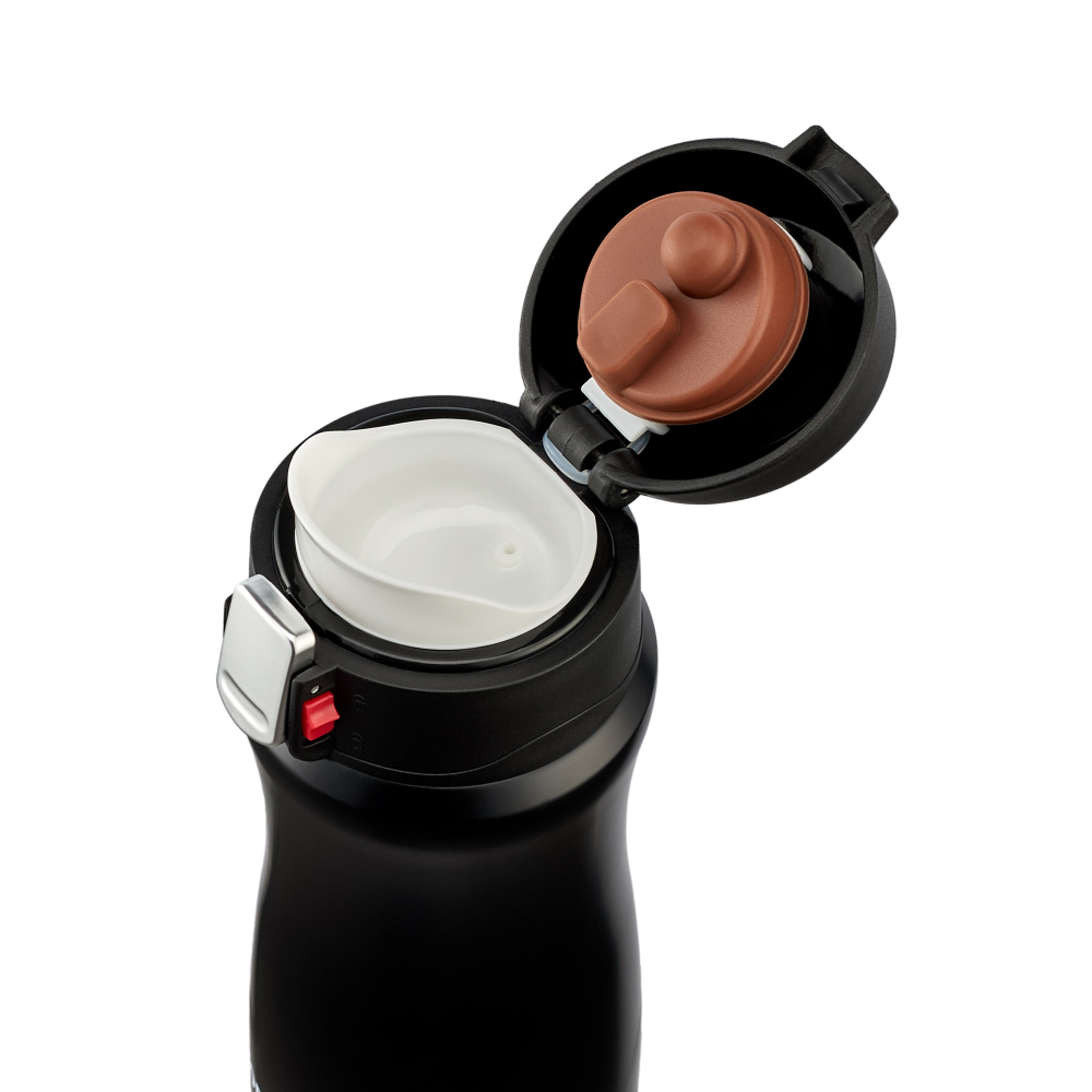 Термокружка из высококачественной нержавеющей стали, 420мл, внутренняя колбаи имеет две стенки с вакуумной камерой между ними, что позволяет долго удерживать температуру, удобно наливать содержимое позволдяет откидная крышка, цвет черный