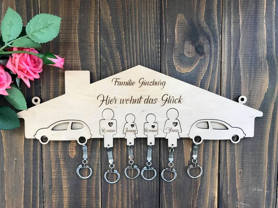 Оригинальным подарком или приобретением станет изделие с фамилией или именами членов семьи. Буквы вырезают из цельного куска дерева или фанеры или рисуют на основе. В качестве дополнительного декора используются различные атрибуты, обозначающие семью и счастливую жизнь: домик, человеческие фигурки и тому подобные элементы. Именная настенная белая ключница либо модели другого цвета отлично впишутся в интерьер и станут еще одним символом семейного единства.