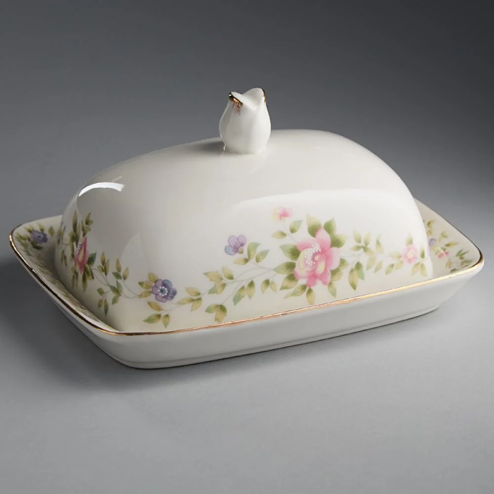 Фарфор – наиболее дорогая керамика. Материал просвечивает на свету, легкий и тонкий, но прочный. Хранение сливочного масла в масленке из фарфора ничем не хуже, чем в посуде из нержавейки. Легко подобрать под фарфоровый набор посуды по дизайну.