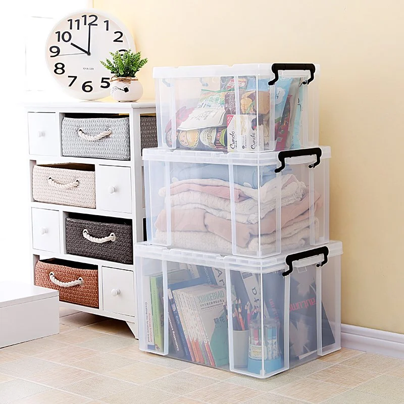 - Пластиковые контейнеры. Чаще всего используются для хранения вещей. Они универсальны. В таких ящиках удобно хранить детские игрушки, инструменты и средства для уборки, запасные детали, мелкую технику. Пластиковые контейнеры очень прочные, долговечные, легко моются. Они могут быть прозрачными, что в некоторых случаях является дополнительным преимуществом – скажем, рукодельница может разложить нитки, пуговицы и ленты по одинаковым ящичкам, но видеть, не открывая, что где лежит. Недостатком пластиковых контейнеров может быть то, что они подойдут не ко всякому интерьеру. Обычно такие контейнеры выглядят просто и функционально, немного по-офисному.