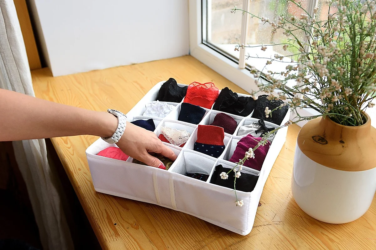 - Если нужно навести порядок на полке с носками, то покупают квадратный или прямоугольный текстильный органайзер без крышки. Исходя из месторасположения бокса можно подбирать его размеры – измеряют длину и ширину полки, а в некоторых случаях еще и высоту выдвижного ящика. И, получив замеры, отправляются в магазин за покупкой.