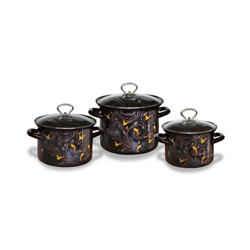 Состав набора: кастрюля 2,4 л, кастрюля 3,4 л, кастрюля 5,0 л.
