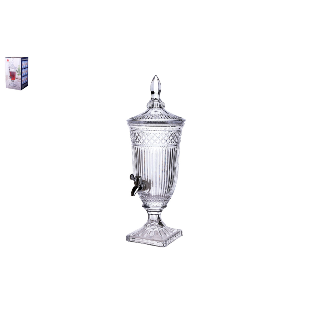 Эффектный диспенсер выполнен из толстого узорного стекла и устойчиво располагается на ровной поверхности. Изделие имеет удобную крышку и краник для комфортной подачи разнообразных напитков.