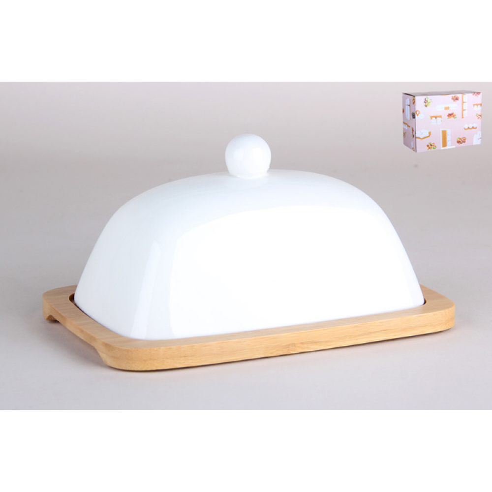 Крышка масленки выполнена из качественного белоснежного фарфора и размещена на бамбуковой подставке. Таким комплектом приятно пользоваться, а также можно дополнить сервировку любого застолья.