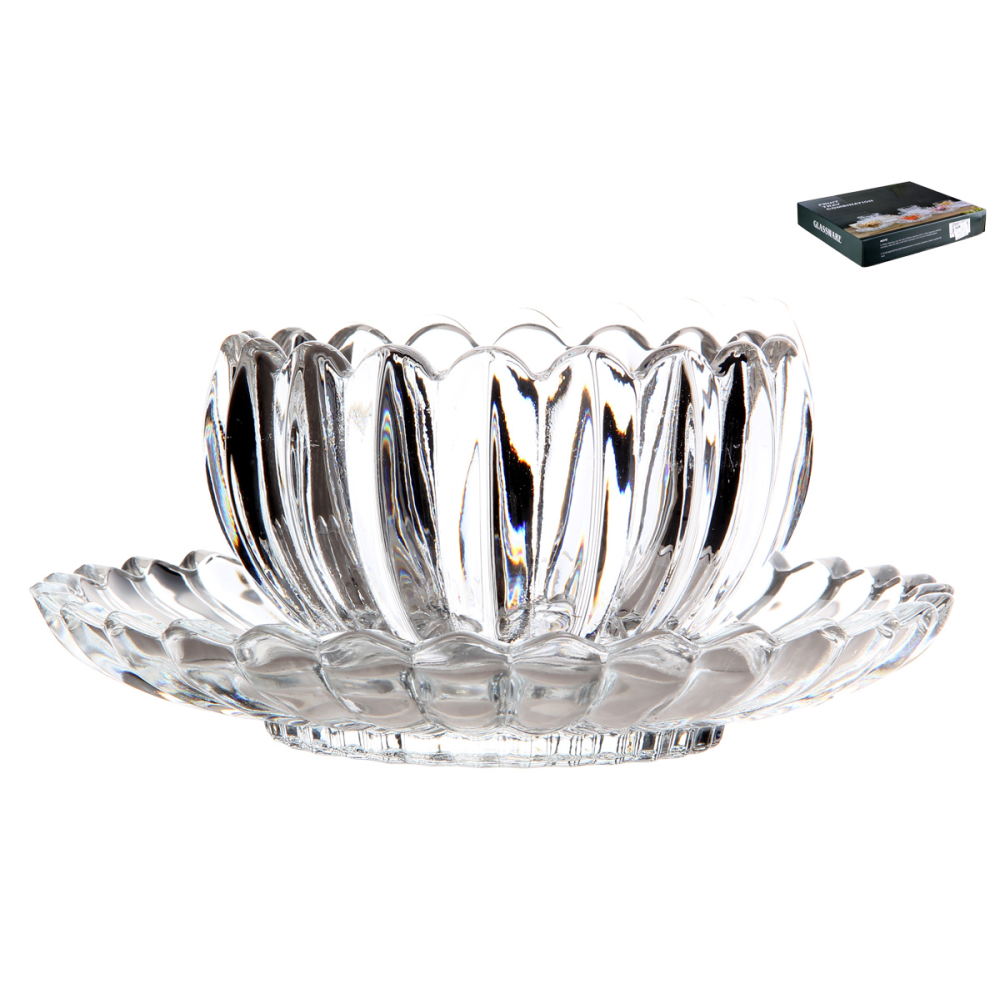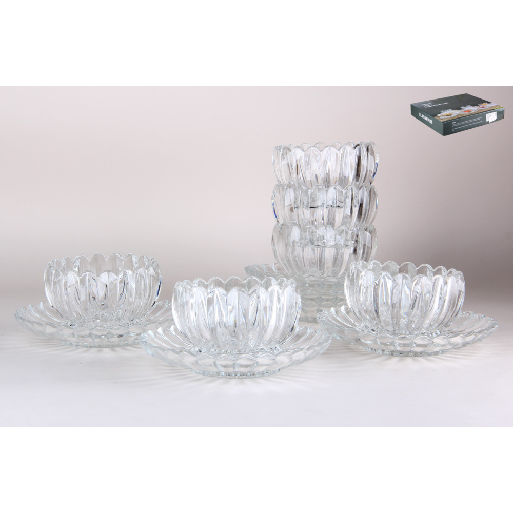 Нарядный комплект состоит из 6 ваз и 6 подстановочных блюдец. Толстое узорное стекло в любой день создает праздничное настроение.