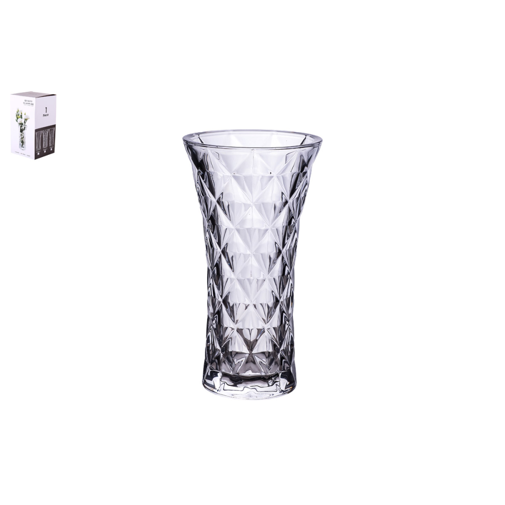 Ваза из прозрачного толстого узорного стекла станет самостоятельным украшением любого интерьера. Изделие великолепно переливается на солнце и излучает приятный блеск.