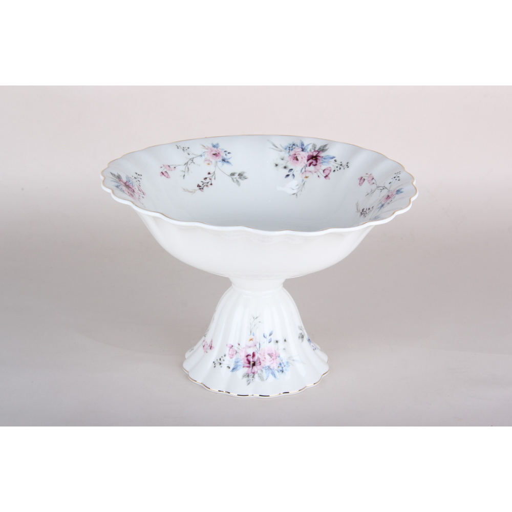 Элегантная фруктовница на ножке изготовлена из белоснежного фарфора. Посуда украшена нежным цветочным рисунком и дополнена изысканной золотой отделкой.