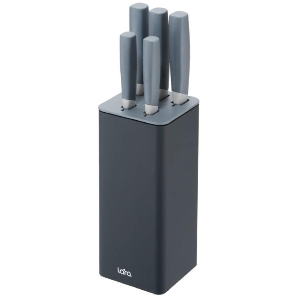 Набор ножей LARA LR05-71 – это универсальный набор 5 в 1 с дополнительной системой хранения. Благодаря подставке занимают мало места и стильно смотрятся на кухне. Ножи идеально сбалансированы, для защиты оснащены больстером между рукоятью и лезвием. Для большего удобства ручки ножей имеют покрытие Soft touch. Устойчивая подставка обеспечивает правильное хранение, благодаря чему ножи долго остаются острыми. В комплекте: подставка 98х220 мм с индивидуальными пластиковыми слотами для бережного хранения, шеф-нож, нож для нарезки хлеба, универсальный нож, нож для очистки, нож для нарезки.
