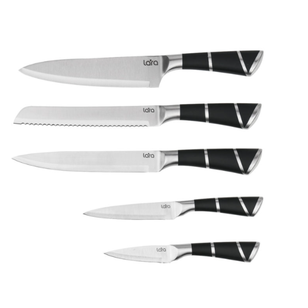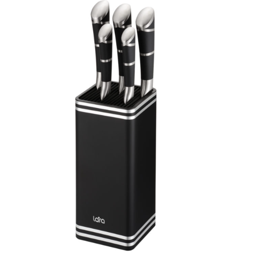 Набор ножей LARA LR05-75 – это универсальный набор 5 в 1 с дополнительной системой хранения. Ножи идеально сбалансированы, для защиты оснащены больстером между рукоятью и лезвием. Мы проработали дизайн набора и добавили стильные акценты на ручки и подставку. Для комфортного использования ручки имеют мягкое покрытие Soft touch. Устойчивая подставка обеспечивает правильное хранение, благодаря чему ножи долго остаются острыми. В комплекте: подставка 98х220 мм с пластиковыми слотами для бережного хранения, шеф-нож, нож для нарезки хлеба, универсальный нож, нож для очистки, нож для нарезки.