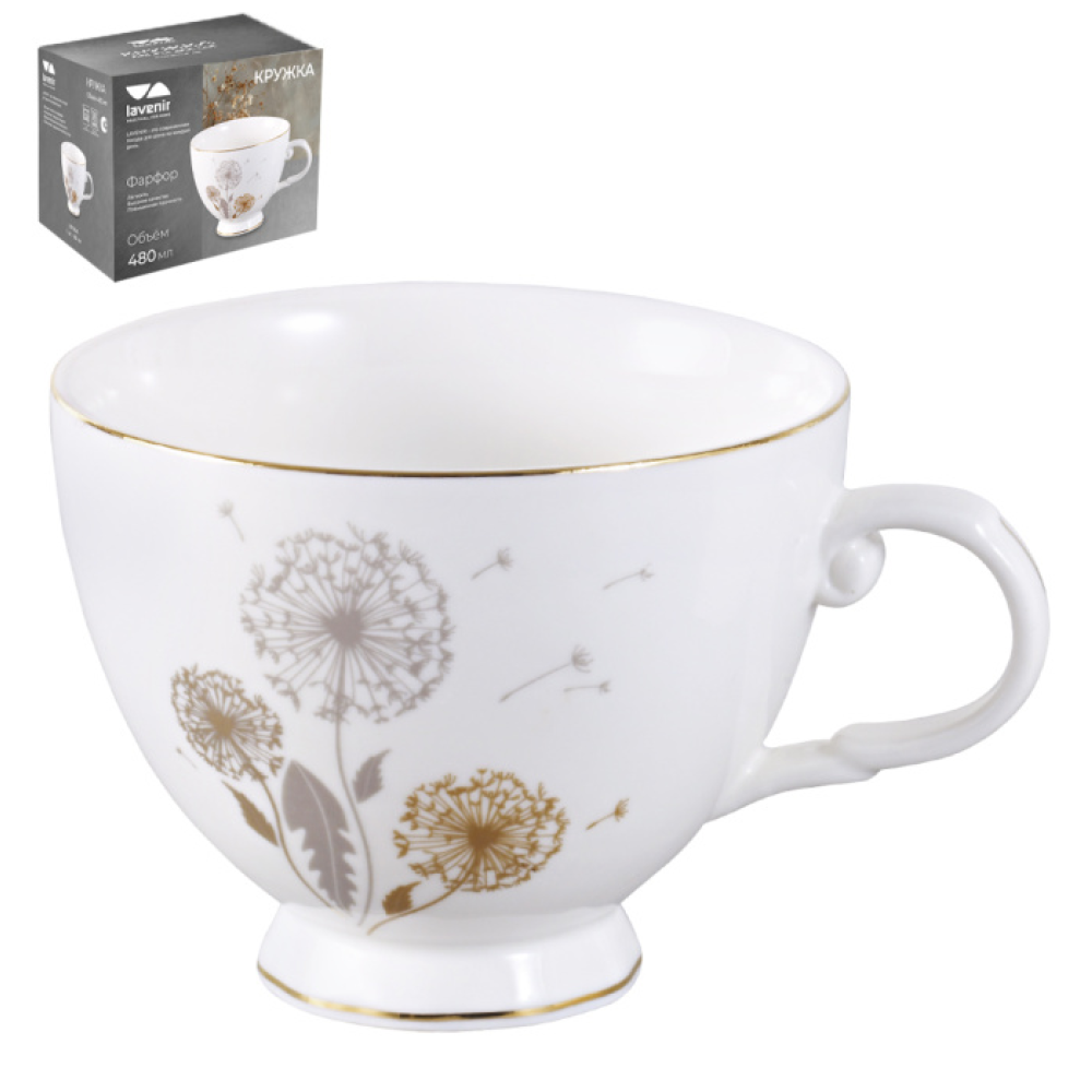 Кружка Lavenir «Одуванчики» 480 мл 222-500 в подарочной упаковке (артикул 00113491) — белая фарфоровая кружка с золотым ободком.