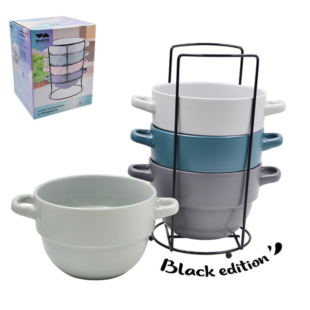 - Комплектация: 4 супницы, металлическая подставка, подарочная упаковка.