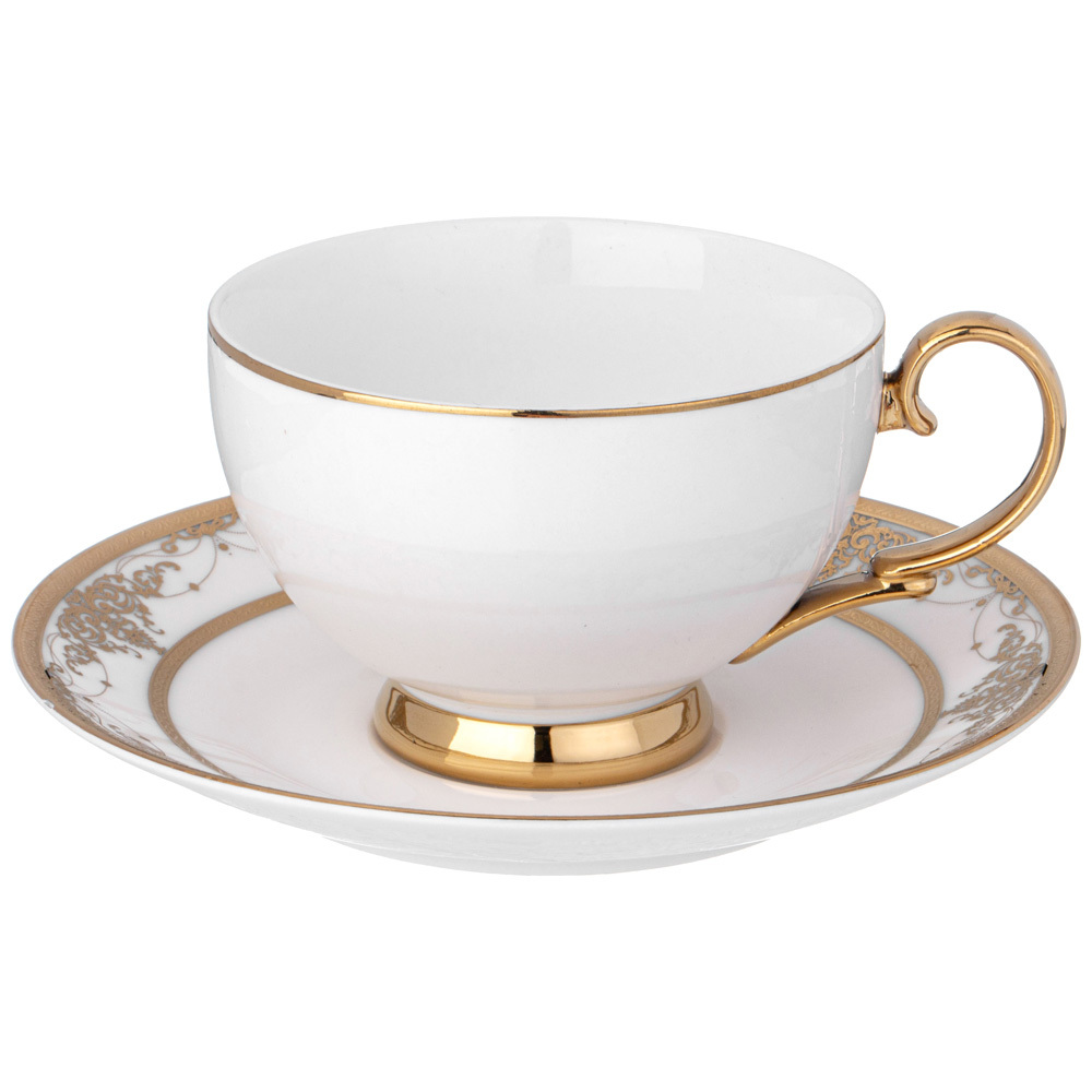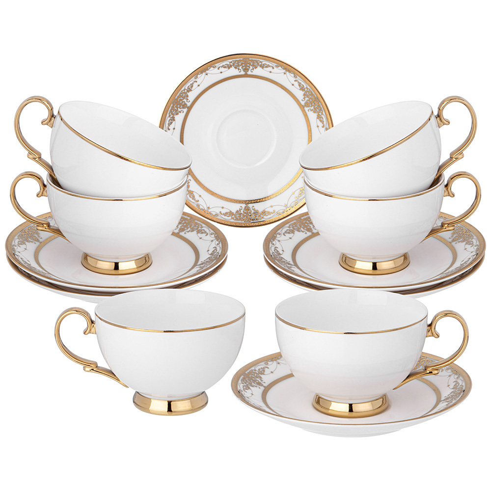 ТМ LEFARD Чайный набор "Дворец" для торжественых застолий и семейных обедов. Изысканный фарфор Bone Pocelain с эффектом костяного фафора, тонкий и полупрозрачный, прочный и никогда не темнеет. Утонченный кружевной рельефный орнамент выглядит объемным и привлекательным благодаря различной обработке выпуклых и базовых поверхностей. Изящная золотая обводка придает блеск и торжественность. Эта посуда замечательный подарок на свадьбу, юбилей, день рождения, который наверняка пригодится каждой семье, запомнится навсегда и прослужит долгие годы. Дизайнеры торговой марки предлагают чайный и обеденный сервизы и наборы тарелок и чайных пар, чтобы сформировать полную сервировку стола предметами коллекции на 6 или 12 персон. Не рекомендуется мыть в посудомоечной машине. Нельзя использовать в микроволновой печи. Комплектность: чашка 300 мл 6 шт., блюдце 6 шт.