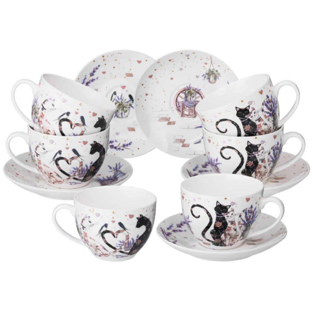 Чайный набор Lefard «Лавандовые коты» на 6 персон, 12 предметов, объём чашек — 275 мл (артикул 425-173) — это сервиз из фарфора с эксклюзивным дизайном. Предметы украшены изображениями влюблённых котов в окружении нежных соцветий лаванды. Набор подходит для ежедневного использования и праздничной сервировки стола.