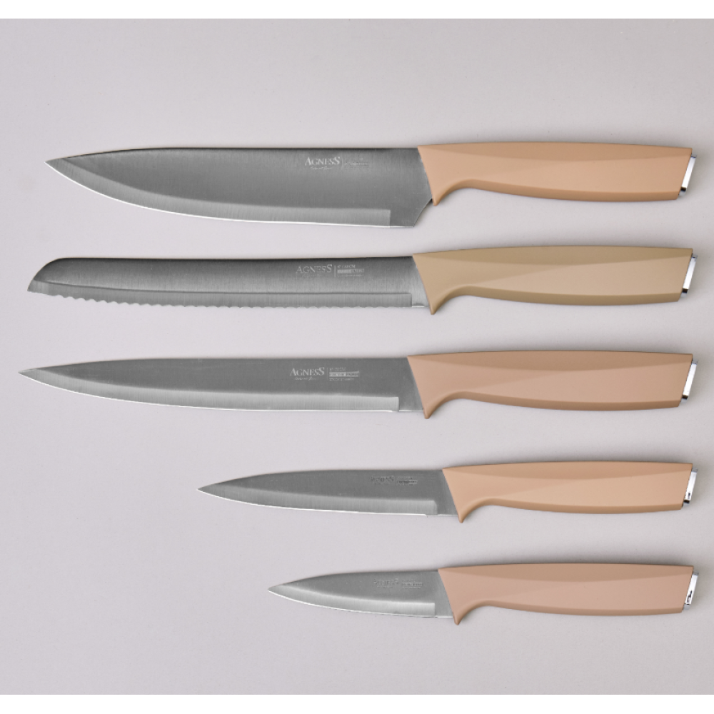 Нож - главный инструмент на кухне, а вернее ножи, т.к. даже самый лучший нож не сможет справиться со всем многообразием задач. Выбирая набор ножей AGNESS - Вы приобретаете комплект самых необходимых и чаще всего используемых ножей. Преимущества ножей AGNESS: ● Лезвие из коррозионностойкой стали ● Эргономичная ручка с покрытием Soft Touch для удобной нарезки ● 2-х стороняя заточка лезвия ● Удобная подставка ● Для экономии рабочего пространства Вы легко можете хранить все ножи в подставке Рекомендована ручная мойка.