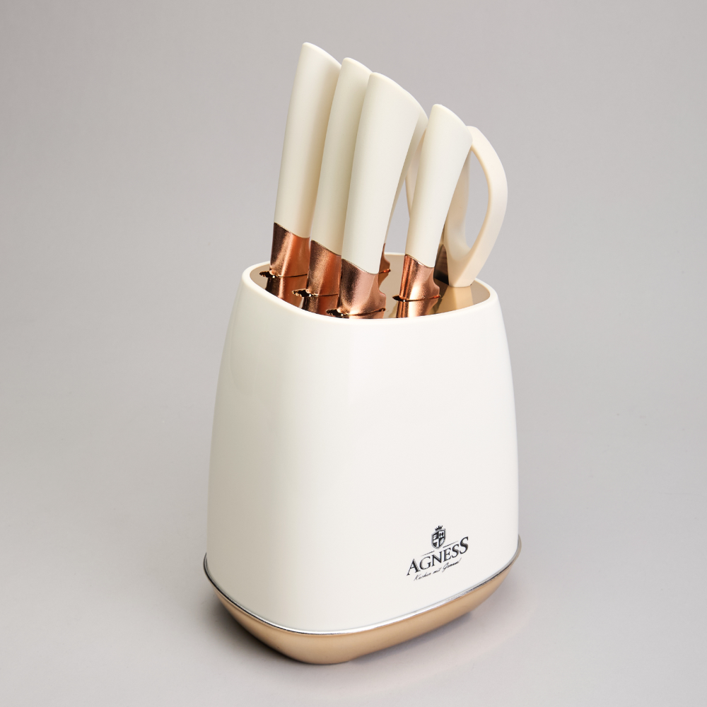 Нож - главный инструмент на кухне, а вернее ножи, т.к. даже самый лучший нож не сможет справиться со всем многообразием задач. Выбирая набор ножей AGNESS - Вы приобретаете комплект самых необходимых и чаще всего используемых ножей. Преимущества ножей AGNESS: ● Эргономичные ручки ● Лезвие из коррозионностойкой стали с 2-х стороней заточкой ● Удобная пластиковая подставка. ● Состав набора: Нож поварской 20см, Нож для нарезки 20см, Нож для хлеба 20см, Нож универсальный 12,5см, Нож для чистки овощей и фруктов 9см, Ножницы для птицы. Рекомендована ручная мойка.