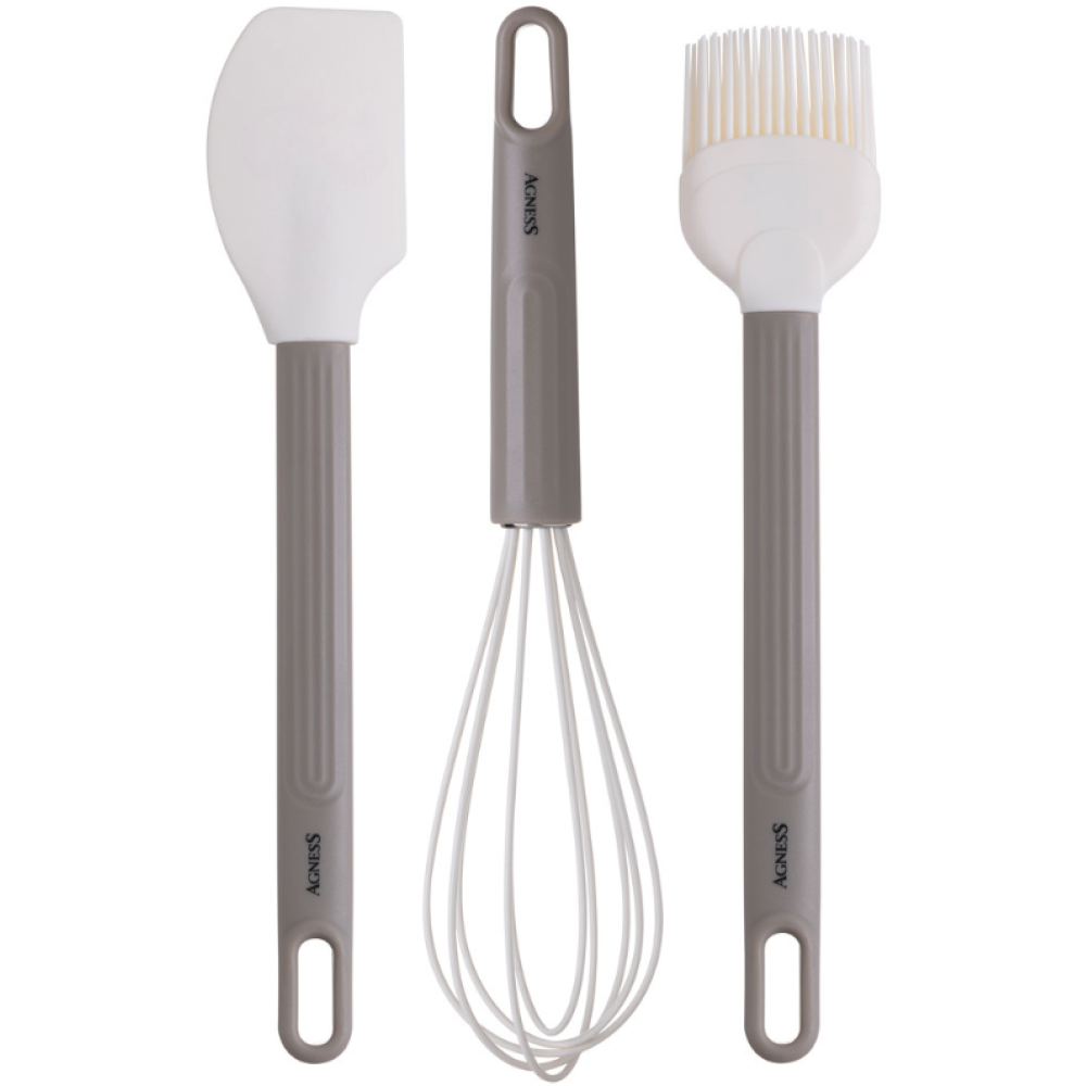 Набор Agness 671-025-1 — это комплект из трёх кухонных аксессуаров: венчика, лопатки и кисточки. Набор предназначен для приготовления пищи и выпечки.