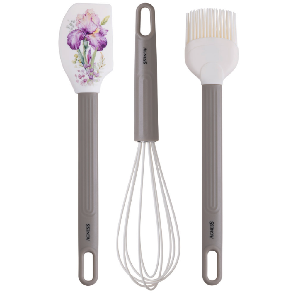 Набор Agness 671-031 — это комплект из трёх кухонных аксессуаров: венчика, лопатки и кисточки, выпущенный в серии Irises. Набор предназначен для приготовления пищи и выпечки.