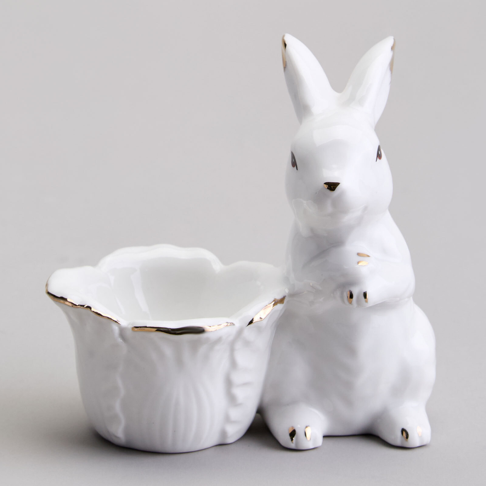 Подставка выполнена в форме очаровательного кролика, который держит в лапках подставку для яйца. Изящные линии и лёгкие позолоченные акценты по краям придают изделию особую элегантность и изысканность.