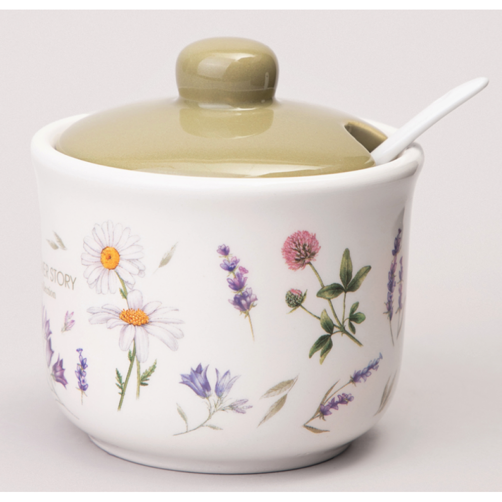 Сахарница с ложкой Agness Flower Story (артикул 358-2186) — это предмет сервировки из доломитовой керамики, входящий в одноимённую серию бренда Agness. Она предназначена для хранения сахара или других сыпучих продуктов.