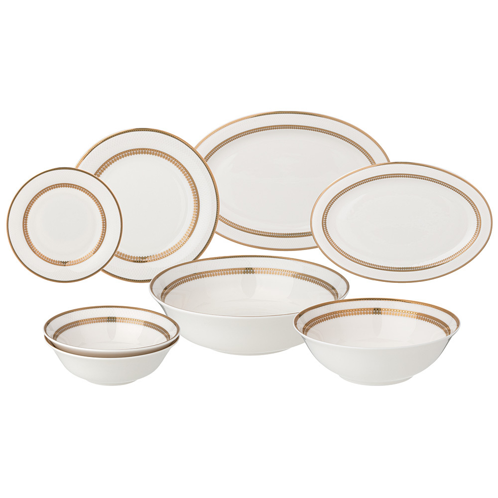 ТМ LEFARD Сервиз столовый "Праздничный" для торжественных застолий и семейных обедов. Изысканный фарфор Bone Pocelain с эффектом костяного фафора, тонкий и полупрозрачный, прочный и никогда не темнеет. Классический рельефный орнамент в виде сетки выглядит объемным и привлекательным. Пересекающиеся линии уходят в бесконечность. Состояние движения подталкивает к движению вперед, наполняя энергией. Изящный золотой кант придает блеск и торжественность. Эта посуда замечательный подарок на юбилей, день рождения, новоселье, который наверняка пригодится каждой семье, запомнится навсегда и прослужит долгие годы. Дизайнеры торговой марки предлагают чайный сервиз и наборы тарелок и чайных пар, чтобы сформировать полную сервировку стола предметами коллекции на 6 или 12 персон. Не рекомендуется мыть в посудомоечной машине. Нельзя использовать в микроволновой печи.