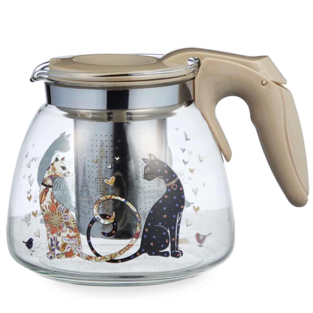Заварочный чайник Agness с фильтром «Парижские коты» объёмом 900 мл и артикулом 885-118 — это стеклянный чайник с металлическим фильтром, предназначенный для заваривания чая, травяных сборов или плодов шиповника. Он сочетает функциональность и декоративный дизайн, который может стать украшением стола.
