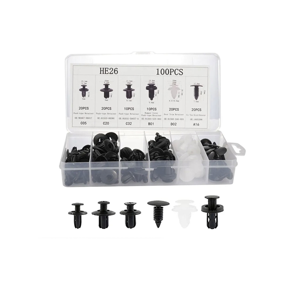 Набор автомобильных клипс ECOS EA-32 — это комплект из 100 универсальных крепежных элементов, предназначенных для надежной фиксации различных деталей в салоне и кузове автомобиля. В набор входит шесть типов клипс, каждый из которых выполняет свою функцию и подходит для разных видов креплений. В ассортименте представлены клипсы следующих типов: C05 — 20 шт., C20 — 20 шт., C32 — 10 шт., B01 — 10 шт., D02 — 20 шт., A16 — 20 шт. Все клипсы выполнены из прочного АБС-пластика, что обеспечивает долговечность и устойчивость к нагрузкам и воздействию окружающей среды. Цветовая гамма набора включает черные и белые клипсы, что позволяет подобрать наиболее подходящий вариант под цвет автомобиля и скрыть крепежные элементы. Упаковка выполнена в виде пластиковой коробки, дополненной пакетом с подвесом и стикером, что удобно для транспортировки, хранения и организации. Такой набор идеально подходит для проведения ремонтных работ, обслуживания автомобиля или замены поврежденных креплений, позволяя быстро и надежно закрепить панели, обшивки, накладки и другие элементы. Компактный и универсальный, он станет незаменимым помощником для автомастеров и автолюбителей.