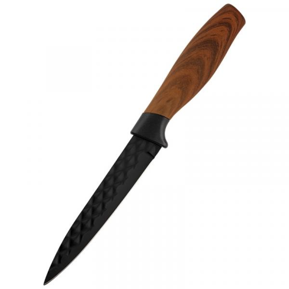 Нож универсальный Длина лезвия: 12,7 см. Толщина стали: 1,2 мм. Пластиковая рукоятка "под дерево" с покрытием софт-тач. Фактурное лезвие с покрытием non-stick. Материал: нержавеющая сталь 2CR14, полипропилен.
