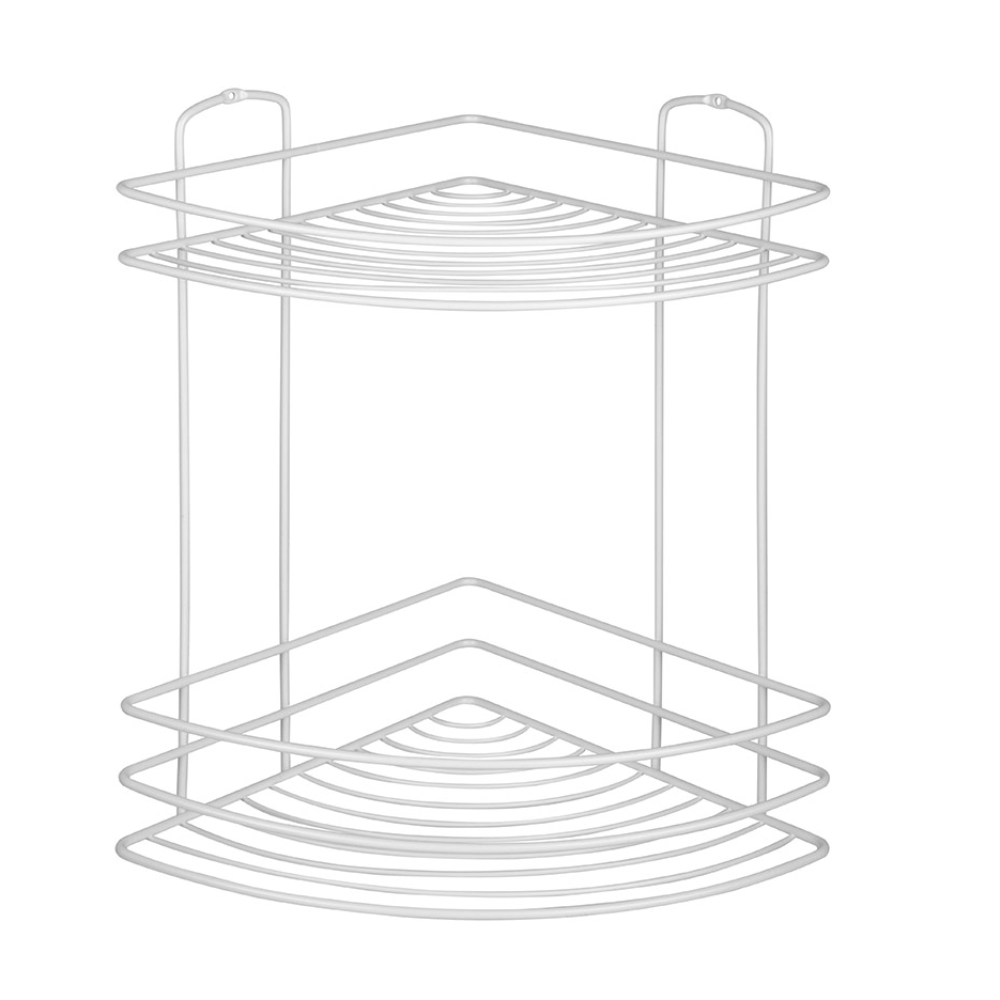 Полка угловая двухъярусная Размер: 21*21*30,5 см. Внешние прутья толщиной 3,5 мм. Внутренние прутья толщиной 2 мм. Цвет: белый. Крепление при помощи 2 шурупов или 2 крючков на самоклеящейся основе (в комплекте). Максимальная нагрузка: 3 кг. Материал: металл с порошковой окраской, ПВХ. Вес: 458 г.