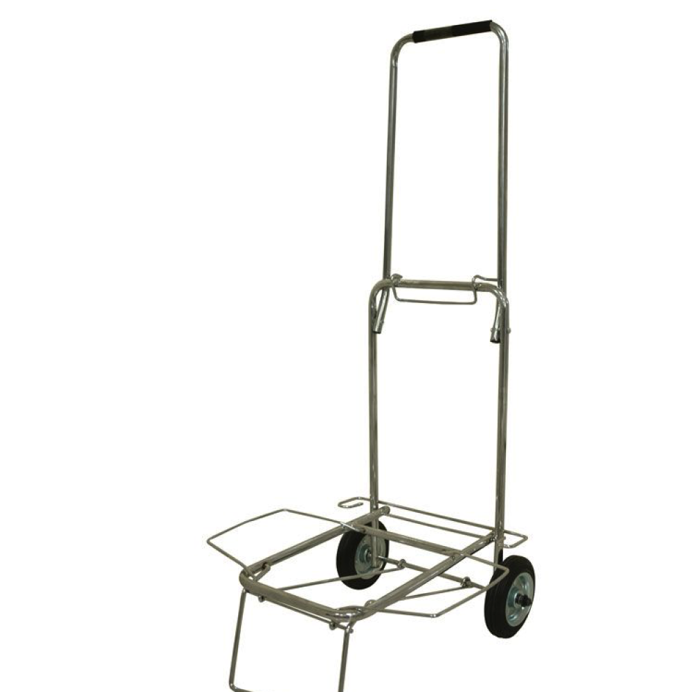 Тележка хромированная Материал: хромированный металл, резина Размер: 42х37х90 см Металлические колеса: 12,5х3,3 см Грузоподъемность: 40 кг Вес: 2,3 кг Притяжной ремень: 120 см Упаковка: П/э пакет с биркой