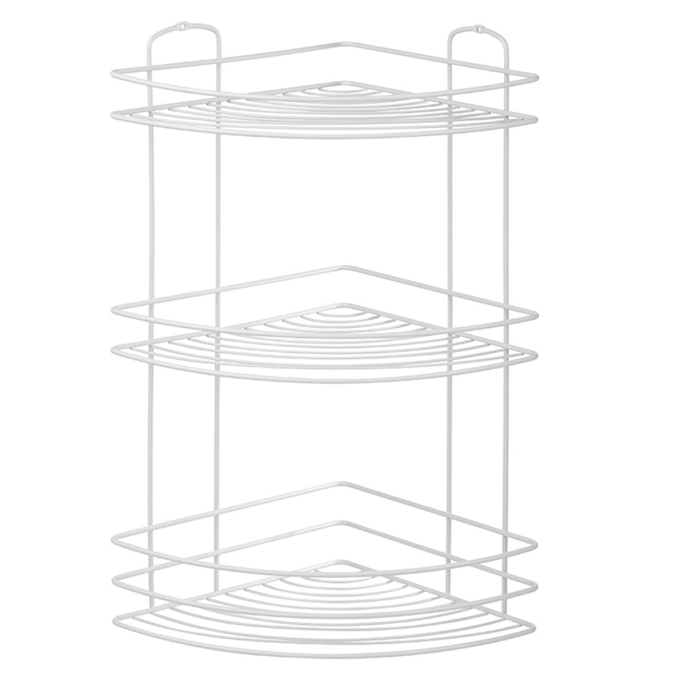 Полка угловая трехъярусная Размер: 21*21*41,5 см. Внешние прутья толщиной 3,5 мм. Внутренние прутья толщиной 2 мм. Цвет: белый. Крепление при помощи 2 шурупов или 2 крючков на самоклеящейся основе (в комплекте). Максимальная нагрузка: 4,5 кг. Материал: металл с порошковой окраской, ПВХ. Вес: 665 гр.