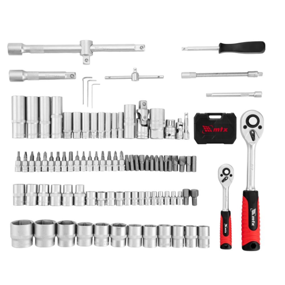 Набор инструментов MTX 13530 упакован в пластиковый кейс и состоит из 94 предметов с присоединительным размером 1/2" и 1/4", предназначенных для монтажа и демонтажа резьбового крепежа с разными типами шлицев. В комплект поставки входят карданы, удлинители и переходники, облегчающие работу в труднодоступных местах. Набор используется для ремонта автомобилей, а также полезен в быту.