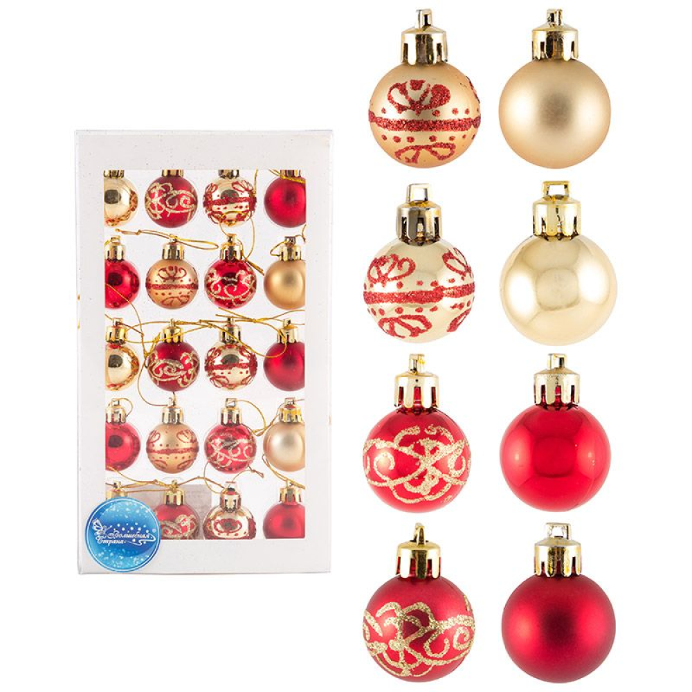Набор шаров размер: 3 см кол-во 20 шт (красный с золотом) материал: пластмасса, полиэстер упаковка: коробка