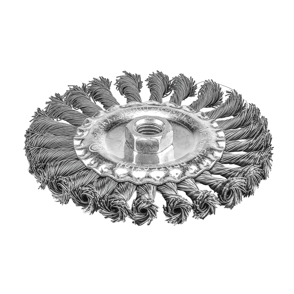 Дисковая кордщетка с проволокой из высокопрочной стали. Подходит для зачистки поверхностей, удаления покрытий, краски, ржавчины, следов сварки, обработки узких кромок, рам и решеток.