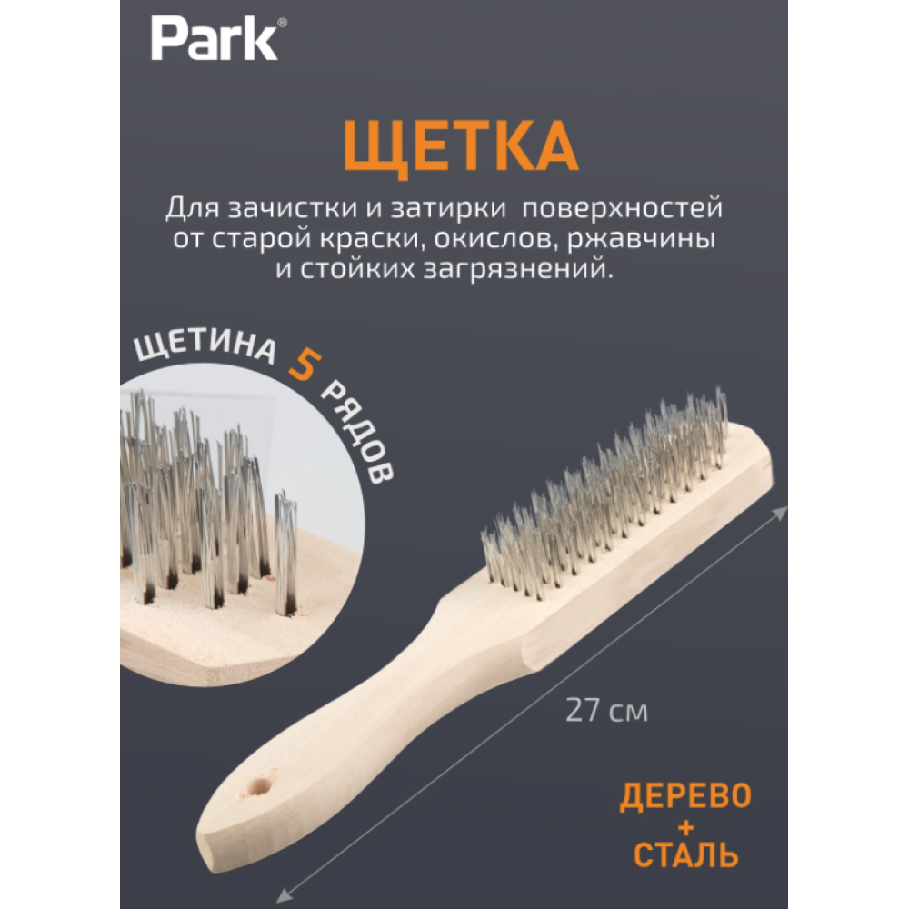 5 рядов Длина: 27 см Материал ручки: дерево Материал щетины: сталь Применяется для зачистки и затирки различных видов поверхностей. Упаковка: стикер
