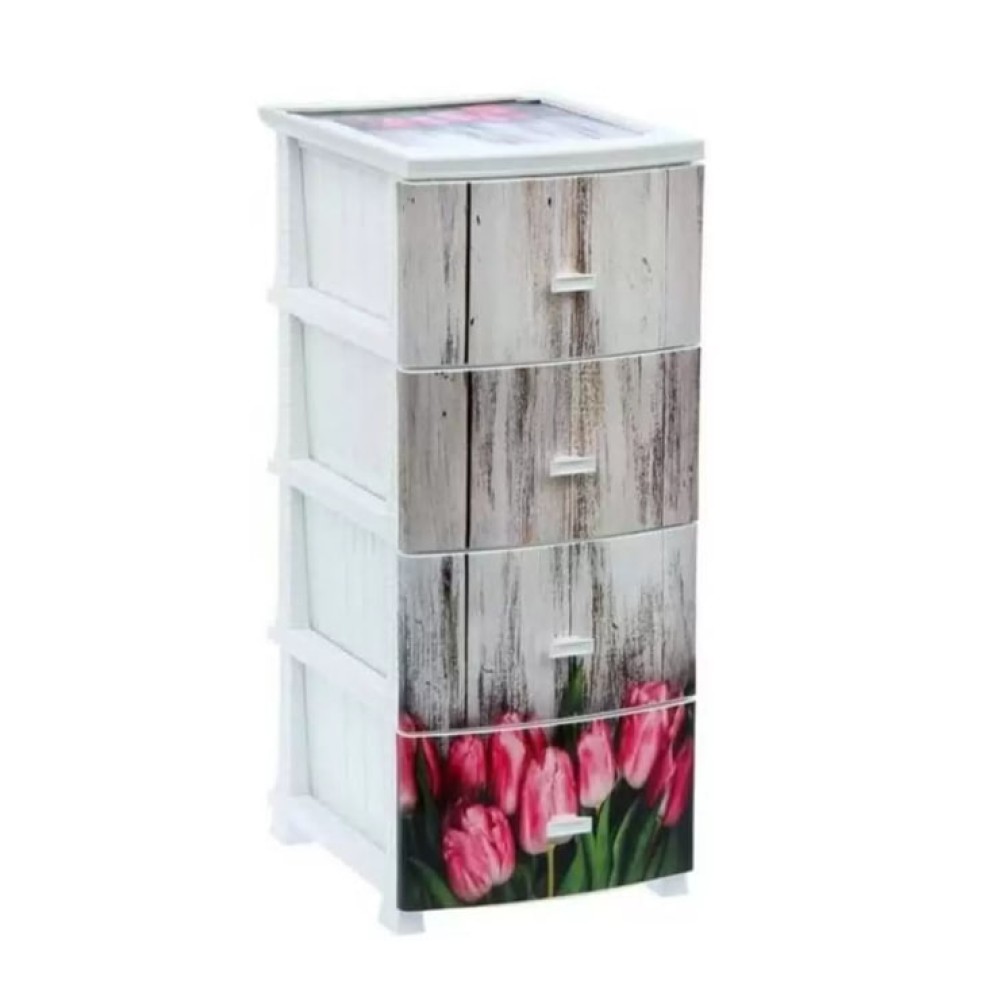Комод из пластика с четырьмя выдвижными ящиками гармонично впишется в интерьер любой комнаты. Он предназначен для хранения вещей и продуктов питания. Легкий и вместительный комод поможет обеспечить порядок в доме. Рисунок на передних панелях придаст индивидуальность и подарит настроение. Не рекомендуется размещение близи батарей центрального отопления и электрических обогревателей.
