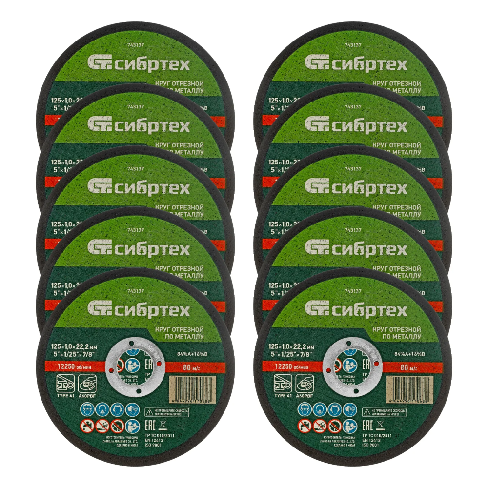 Круг отрезной по металлу, 125 х 1,0 х 22,2 мм, 84%A+16%B, в пленке, 10 шт Сибртех 743133