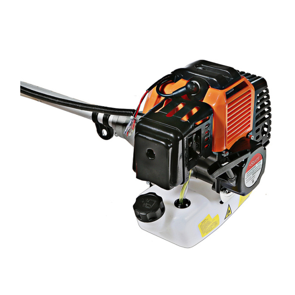 Модель оснащена мощным и экономичным двухтактным двигателем рабочим объемом 42.7 куб см (мощность 3 кВт), позволяющим уверенное использование в качестве режущей оснастки не только косильных головок с леской разных видов, но и металлических ножей, рассчитанных на скашивание густой травы, кустарников, сухостоя. Легкость запуска инструмента гарантирует механизм облегченного старта со специальной дополнительной пружиной. Благодаря праймеру, легкому доступу к свече зажигания, и, полупрозрачному топливному баку модель проста и удобна в обслуживании. Инструмент имеет расширенную базовую комплектацию, куда входят ременной подвес (через одно плечо), косильная головка для лески и фреза.