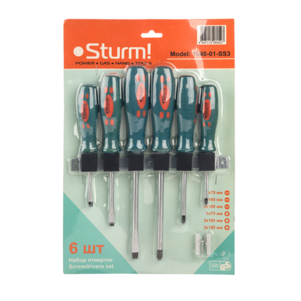 1040-01-SS3 Набор отверток,6 шт, материал ХРОМ-ВАНАДИЕВАЯ СТАЛЬ, + НАСТЕННЫЙ ДЕРЖАТЕЛЬ Sturm! для монтажа и демонтажа крепежных изделий при выполнении ремонтных работ.