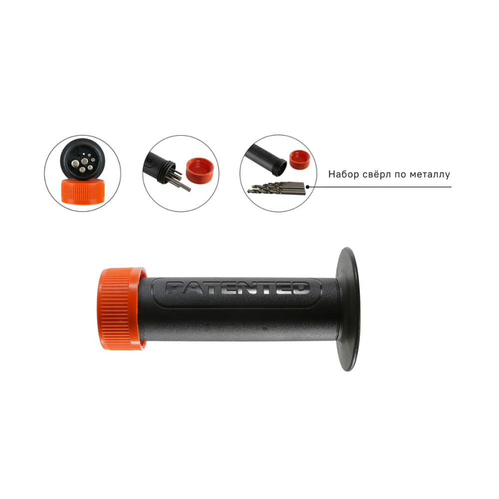 "Рукоятка оснащена уникальной системой хранения свёрл. Теперь они всегда будут под рукой для повышения эффективности работы. Наличие свёрл непосредственно в инструменте позволяет сконцентрироваться на основном процессе и не терять время на поиск расходников. Для каждого сверла сделано индивидуальное углубление в специальном пенале, что исключает их движение в пенале при работе инструментом. "