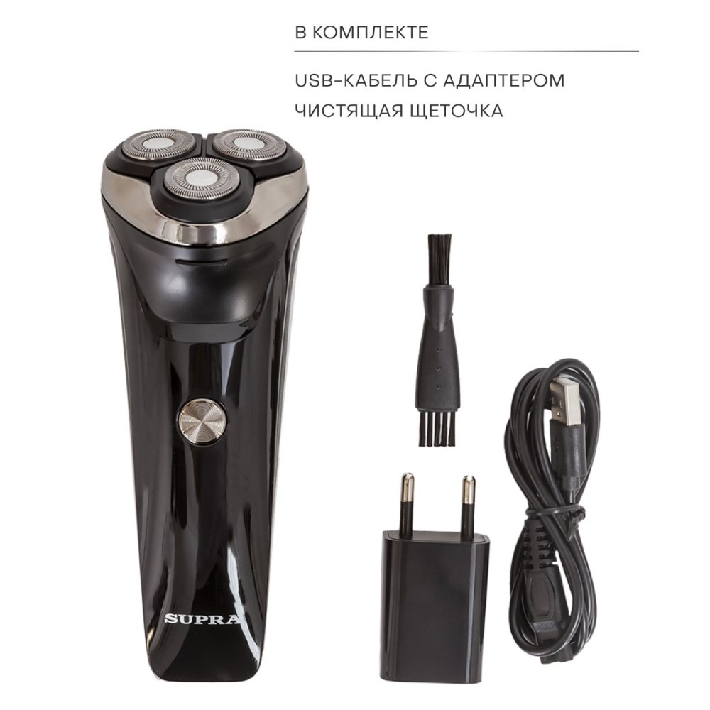 электробритва, USB кабель, защитная крышка, щеточка для чистки, гарантийный талон, инструкция на русском языке